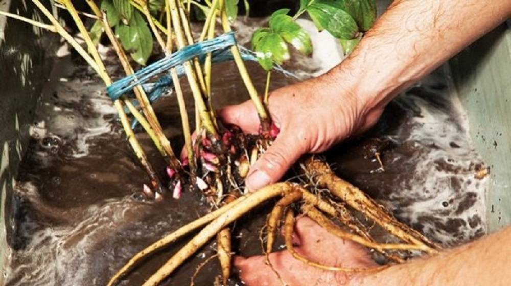 Перед пересадкой пиона на новое место смочите его корни в растворе со стимулятором роста («Гетероауксин», «Укоренитель», «Янтарная кислота»).
