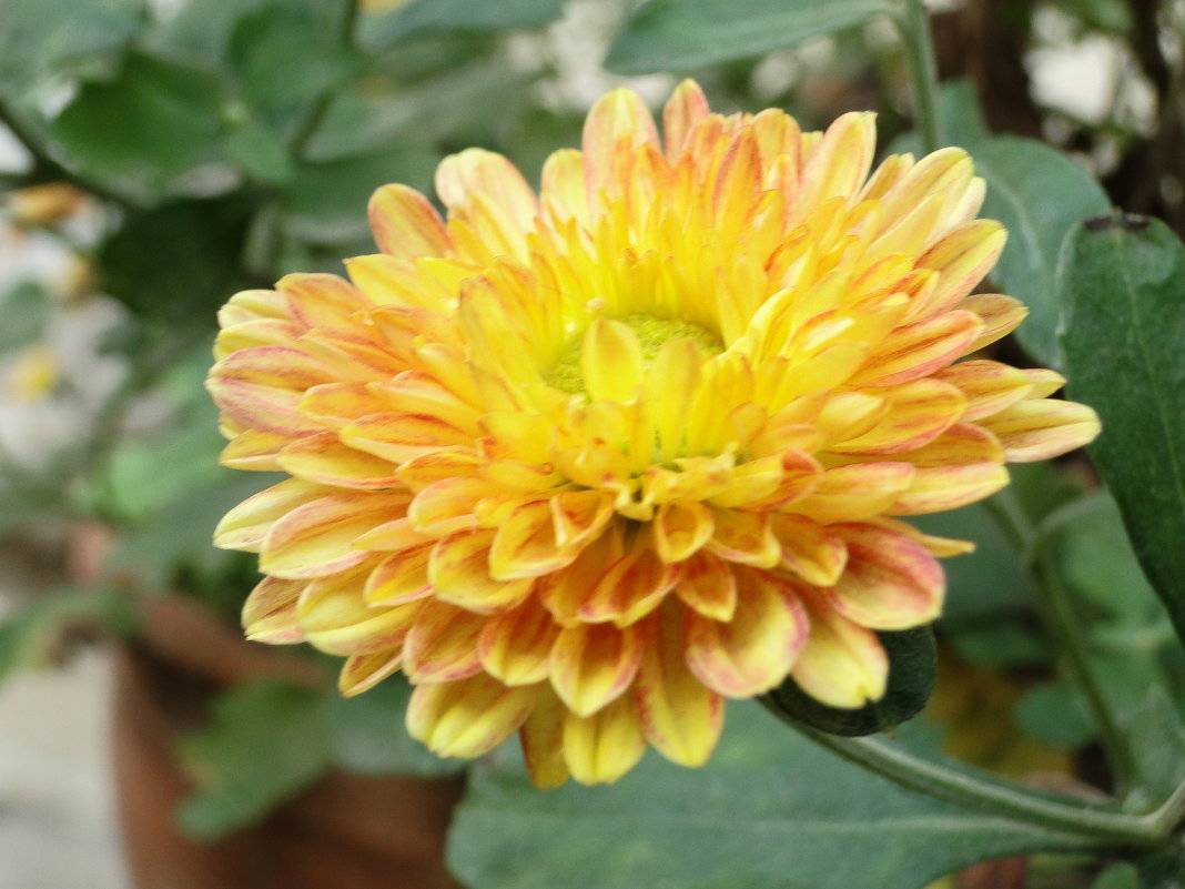 Один из самых долгоцветущих сортов — зацветает в сентябре и отцветает в декабре. Соцветия трехцветные — сердцевина золотисто-желтая, краевые лепестки желто-белые с фиолетовой каймой.