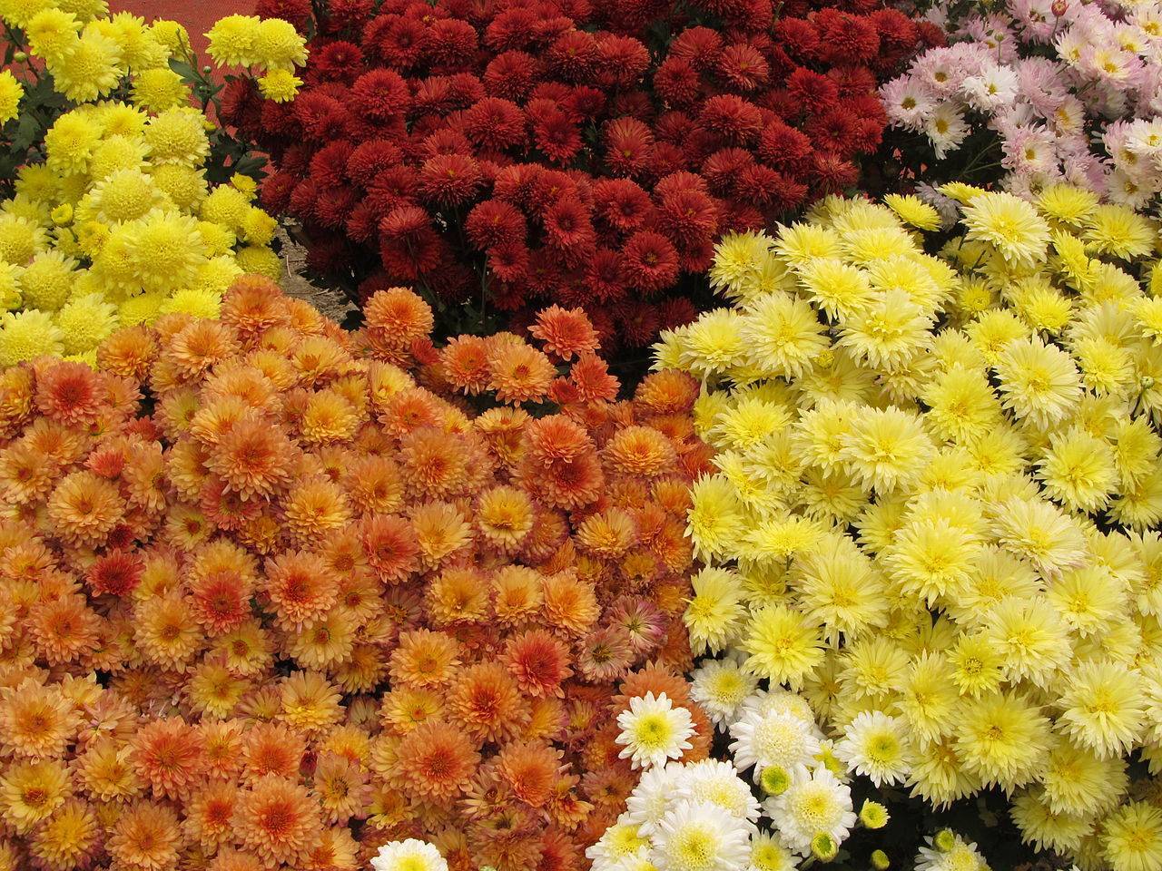 Сорт индийской хризантемы Карнавал имеет много разновидностей с самым разнообразным оттенком — красным, желтым, лимонным, белоснежным и персиковым. Встречаются двух и трехцветные сорта. Характеризуется продолжительным цветением — с сентября по декабрь. Практически у всех сортов этого вида соцветия плотные и махровые.