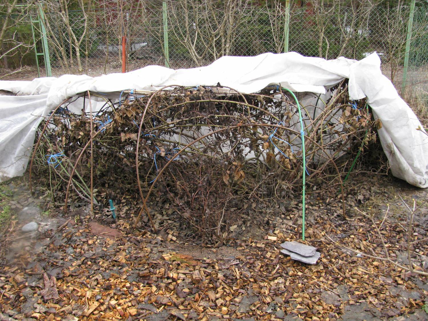 Когда установятся морозы, можно укрывать еловым лапником. Его стоит уложить между кустами, а также поверх них. Необходимо установить опору из проволоки, которая будет составлять каркас. Его впоследствии требуется обтянуть полиэтиленовой пленкой поверх утеплителя.