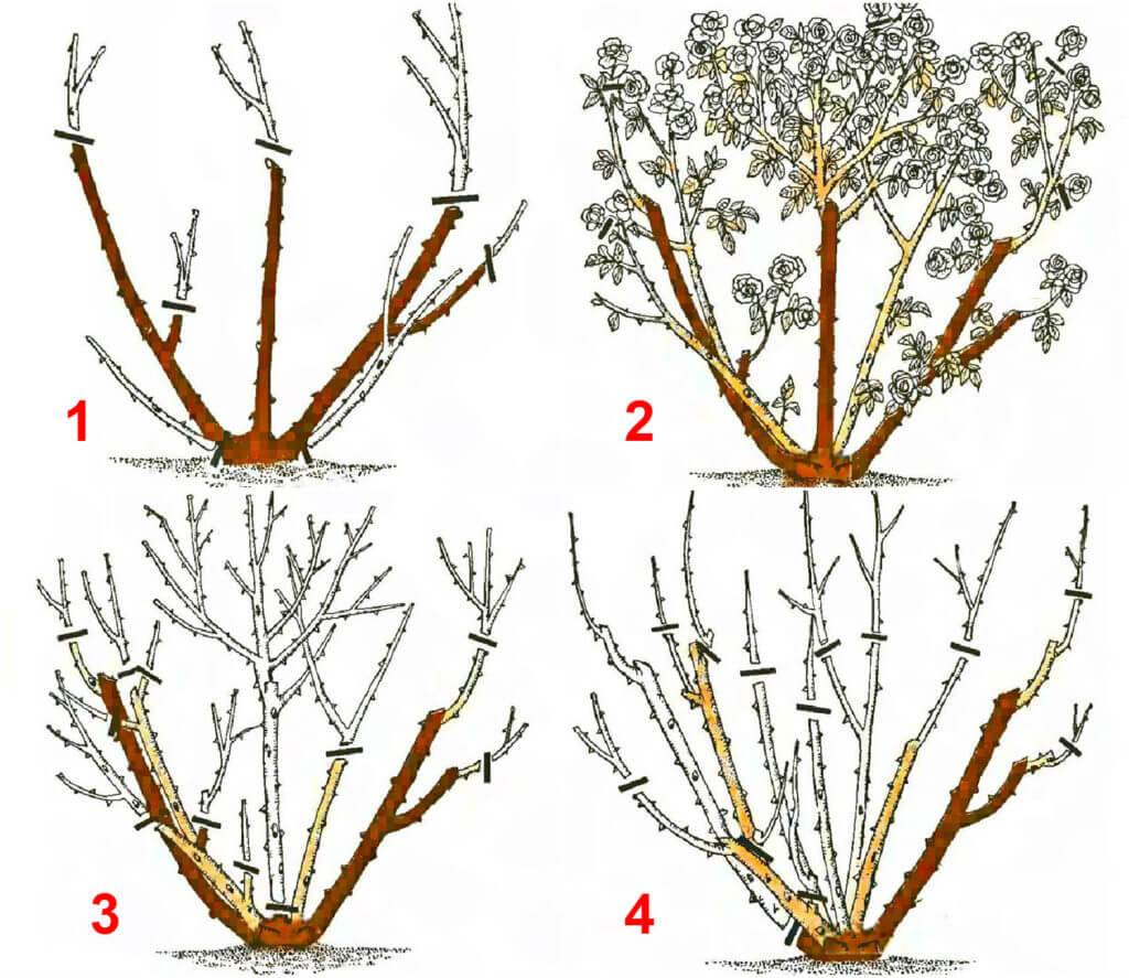 Санитарную и формирующую обрезку обычно проводят весной, удаляя поврежденные и больные ветви, а также те, которые растут вовнутрь кроны куста. Летом обрезают увядшие цветки, чтобы куст выглядел аккуратно, а на побегах активнее формировались новые бутоны. Осеннюю обрезку выполняют с целью подготовки растения к периоду покоя и для удобства организации зимнего укрытия.